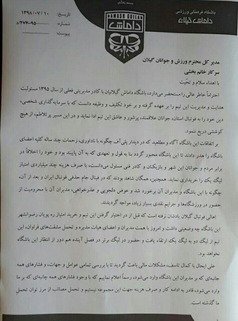 احتراماً خاطر عالی را مستحضر میدارد، باشگاه داماش گیلانیان با کادر مدیریتی فعلی از سال ۱۳۹۵ مسئولیت هدایت و مدیریت این تیم را بر عهده گرفته و بر خود تکلیف و وظیفه دانست که با سرمایه گذاری شخصی، دین خود را به فوتبال استان، جوانان علاقمند، پرشور و عاشق این تیم ادا نماید و در این مسیر پرتلاطم از هیچ کوششی دریغ ننمود. بر اتفاقات این باشگاه آگاه و مطلعید که در دیدار پلی آف چگونه با ناداوری زحمات چند ساله کلیه اعضای باشگاه را هدر دادند تا این باشگاه مجبور گردد بنا به قول و تعهدی که به آن پایبند بود و خود را اخلاقاً در برابر مردم و جوانان این شهر و بازیکنان و کادر فنی مسئول میدانست با صرف هزینه چند میلیاردی امتیاز لیگ یک را خریداری نماید.