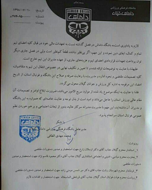 لازم به یاداوری است که باشگاه داماش گیلانیان در فصل گذشته نسبت به تعهدات مالی خود در قبال کلیه اعضای تیم تمام و کمال ایفای دین نموده و در فصل جاری دیگر توان پرداخت تعهدات قراردادی اعضای تیم و هزینه های جاری از عهده مدیران این تیم خارج است. با عنایت به توضیحات ارائه شده و تا تعیین و تکلیف نهایی در خصوص انتقال این تیم به متقاضیان، کلیه تصمیمات مقتضی و نحوه اداره و مدیریت و با رعایت غبطه و صلاح این باشگاه و فوتبال استان ، از تاریخ امضاء این مرقومه به اداره کل ورزش و جوانان گیلان محول میگردد.