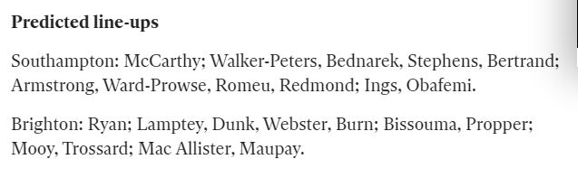 به همین خاطر سایت «independent» انگلیس ترکیب احتمالی این دیدار را اعلام کرد که نام علیرضا جهانبخش، هافبک ایرانی در ترکیب 11 نفره برایتون حضور نداشت.