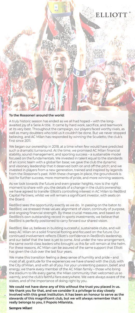 "توافقات لازم صورت گرفته که بر اساس آن، تیم مدیریت فعلی شگفتانگیزمان که باعث رسیدن به چنین جایگاهی بودند، همچنان در کنار ما خواهند ماند و این اطمینان را به شما میدهیم که حمایتی مشابه در طول این چهار سال را نیز در ادامه فعالیتشان خواهند داشت. در حالی که به عملکردمان و افتخارات کسب شده افتخار میکنیم، همکاری با رد برد دیگر سرمایهگذار آمریکایی را پذیرفتیم. از تمام شما که در طول فصل با شور و اشتیاق وصفنشدنیتان از ما حمایت کردید متشکریم. زنده باد میلان"