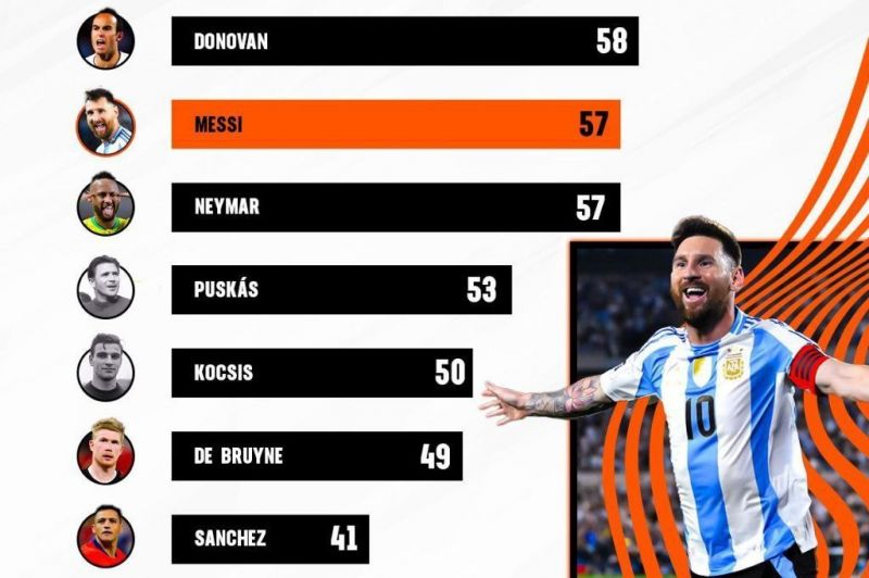 در رتبه نخست این رتبهبندی لاندن داناون، مهاجم اسبق تیم ملی ایالات متحده آمریکا حضور دارد. این بازیکن که سابقه بازی در بایرن مونیخ، اورتون و بایر لورکوزن را در کارنامه دارد، با 58 پاس گل از این حیث رکورددار است. لیونل مسی با 57 پاس گل با پیراهن تیم ملی آرژانتین پشت سر او قرار گرفته است. نیمار هم به اندازه مسی پاس گل داده است. شاید اگر در یک سال اخیر نیمار به تیم ملی برزیل دعوت میشد، میتوانست زودتر از مسی این رکورد را مال خود کند.