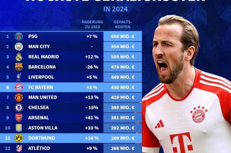 در میان تیمهای آلمانی، بایرن مونیخ با ۴۳۰ میلیون یورو در جایگاه ششم و دورتموند با ۲۶۹ میلیون یورو در رتبه یازدهم قرار دارند. از میان تیمهای انگلیسی، منچستریونایتد (۴۲۹ میلیون یورو)، چلسی (۳۹۵ میلیون یورو)، آرسنال (۳۸۱ میلیون یورو) و استون ویلا (۲۹۲ میلیون یورو) نیز در میان ۱۰ باشگاه برتر قرار دارند. نکته جالب افزایش قابلتوجه هزینههای آرسنال (۴۱٪ افزایش) و استون ویلا (۳۳٪ افزایش) نسبت به سال گذشته است، در حالی که بارسلونا و چلسی کاهش محسوسی داشتهاند. نیوکاسل و تاتنهام نیز به ترتیب ۲۲۷ میلیون و ۲۶۰ میلیون یورو به بازیکنان خود پرداخت کردهاند.