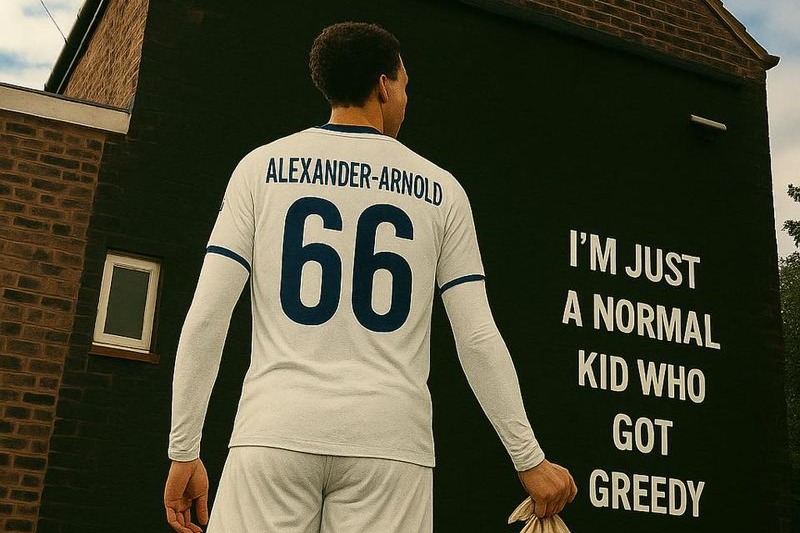 به گزارش فوتبالی، به دنبال خبر جدایی و انتقال به رئالمادرید این اثر که اخیراً در شبکه های اجتماعی منتشر شده، تصویری از آرنولد را به همراه شماره ۶۶ (شماره او در تیم) و جملهای تأملبرانگیز نمایش میدهد: "من فقط یک بچه معمولی هستم که طمعکار شد". این جمله به انتقال آرنولد اشاره دارد که در مصاحبه اخیر درباره خداحافظی قطعی از لیورپول و رسیدن به موفقیت های بزرگتر صحبت کرده بود.