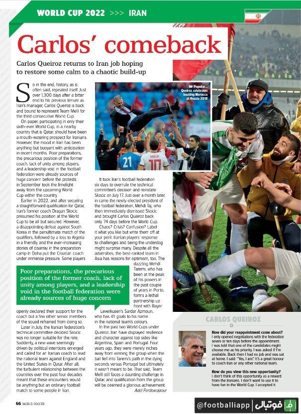 صفحات مربوط به تیم ملی فوتبال ایران در ویژهنامه مجله ورلد ساکر برای جام جهانی قطر ۲۰۲۲ که به معرفی بازیکنان تیم ملی و کارلوس کی ...